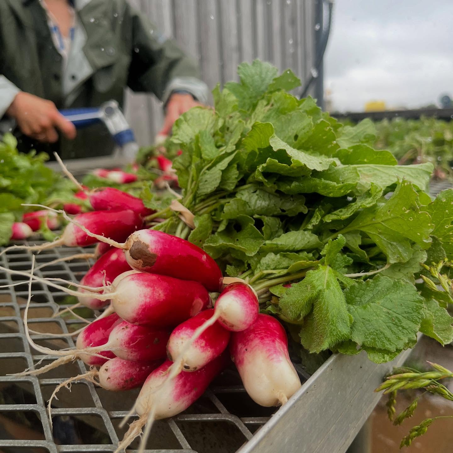 Another wet week but we managed to lay some plastic in fields for our sweet potatoes and first round of watermelon on Monday. Some crops are quite happy with the cooler temps this week. The radishes in particular are quite lovely.
